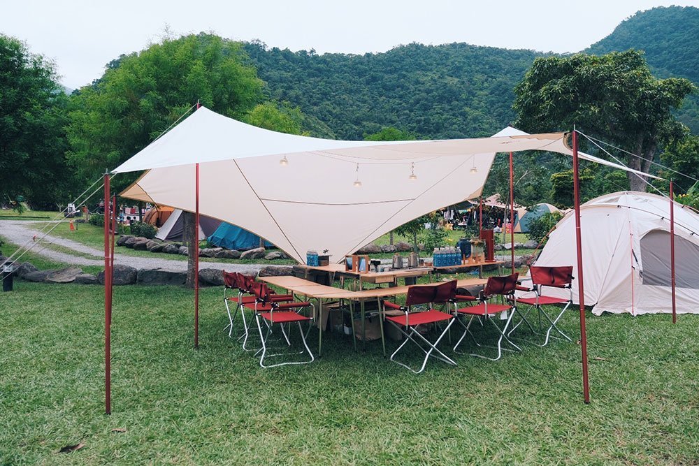 融貫都會小酒館的優雅品味以及紮營於山林野地的隨興氛圍,FIN Bar就坐落在如茵的青草地間,一方面採用雪諾必克(snow peak)出品的高質感白帳篷和桌椅搭構出主體空間,二方面則藉由光影的對比投映出品牌字樣,使得這座拔地而起的半開放式帳篷成為營宿活動中一方休憩避靜的所在地。