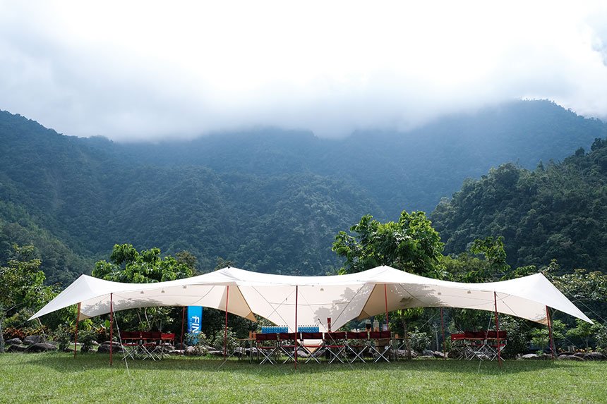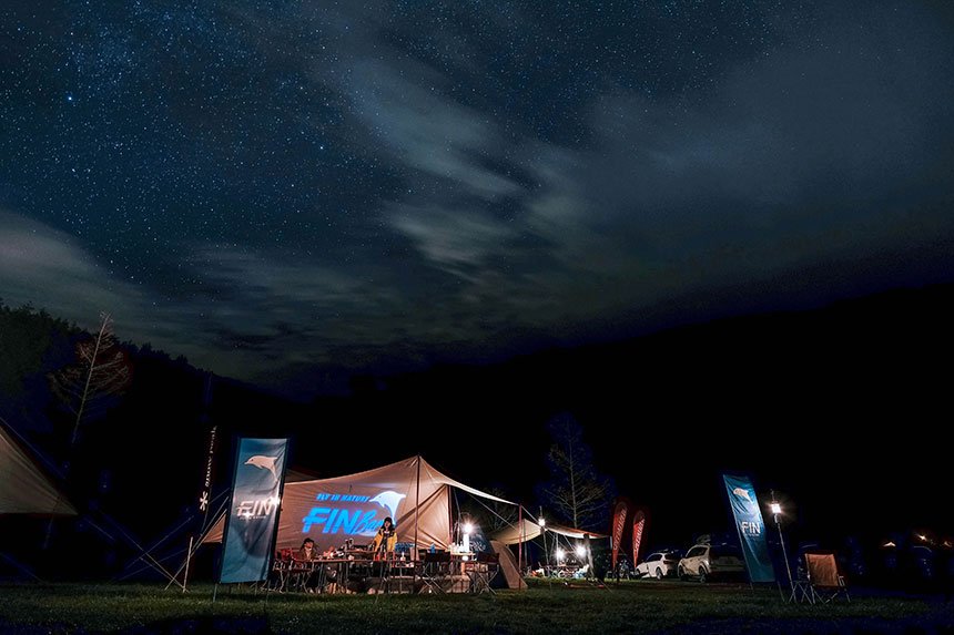 融貫都會小酒館的優雅品味以及紮營於山林野地的隨興氛圍,FIN Bar就坐落在如茵的青草地間,一方面採用雪諾必克(snow peak)出品的高質感白帳篷和桌椅搭構出主體空間,二方面則藉由光影的對比投映出品牌字樣,使得這座拔地而起的半開放式帳篷成為營宿活動中一方休憩避靜的所在地。