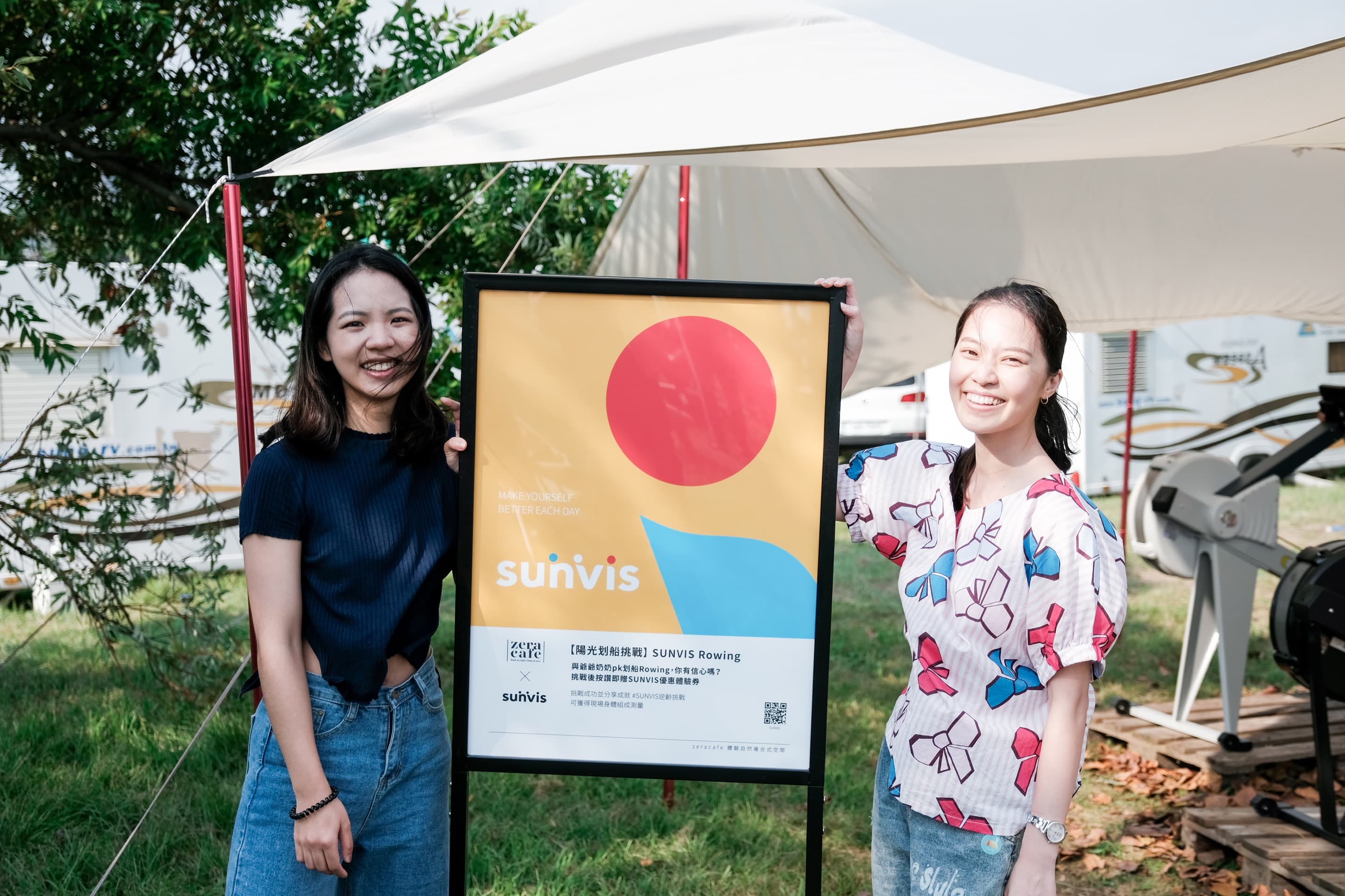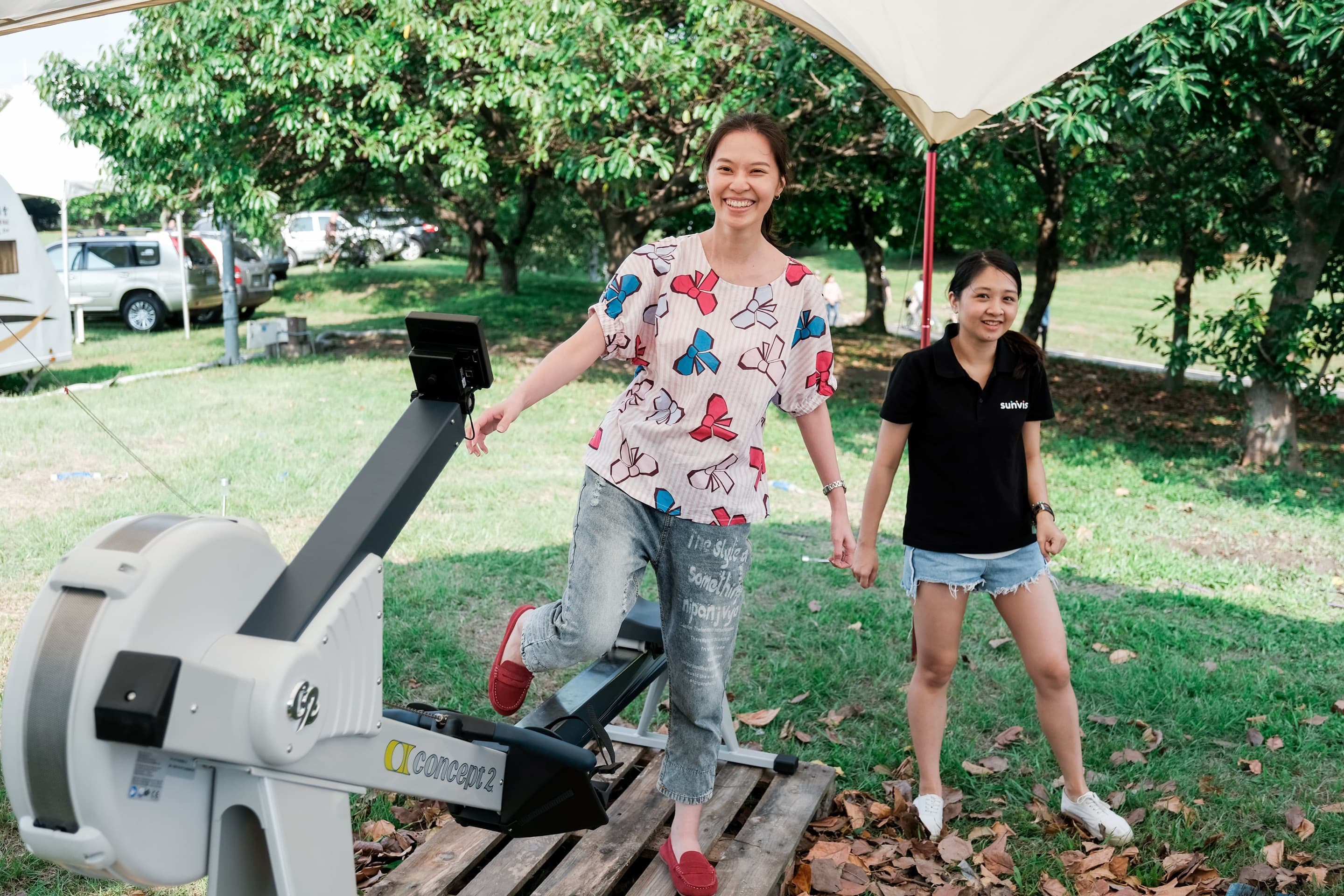 將划船幾搬至戶外,並透過 ViewSonic M1 巧攜投影機與預先製作的互動影片,讓現場的挑戰者能與投影幕中的爺爺奶奶 PK 體能,親身體驗到「年齡」不是問題,持之以恆地健身與飲食,才是保有好體能的關鍵。