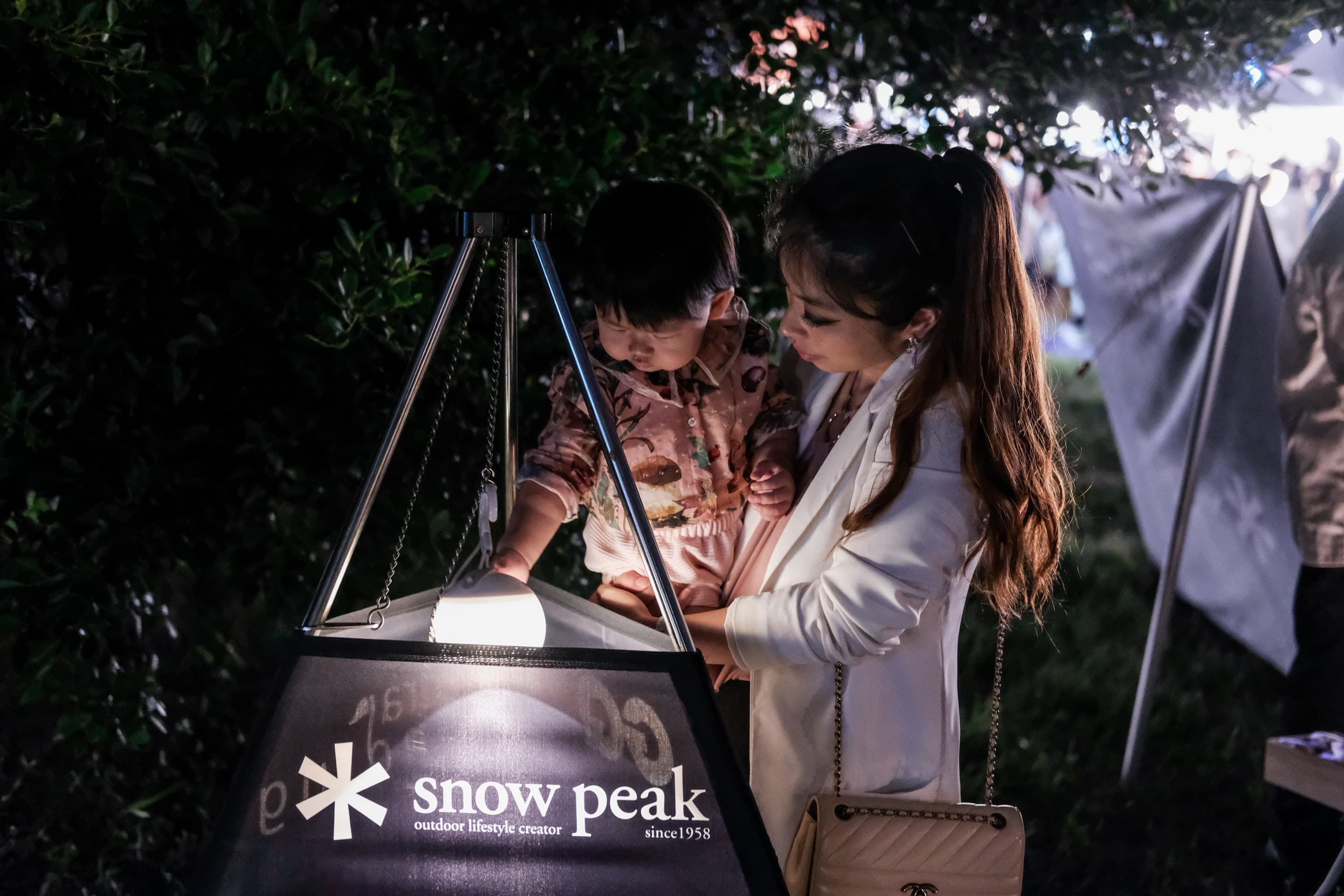 我們與日商 Snow Peak 共同合作,以全場域 Snow Peak 頂級設備搭起白帳,並於夜晚舉辦「營火晚會」,讓現場朋友體驗 Snow Peak 戶外精神文化,更透過企劃與設計物,使全場域的光影與硬體搭配,呈現 Snow Peak 日式匠心工藝之美。