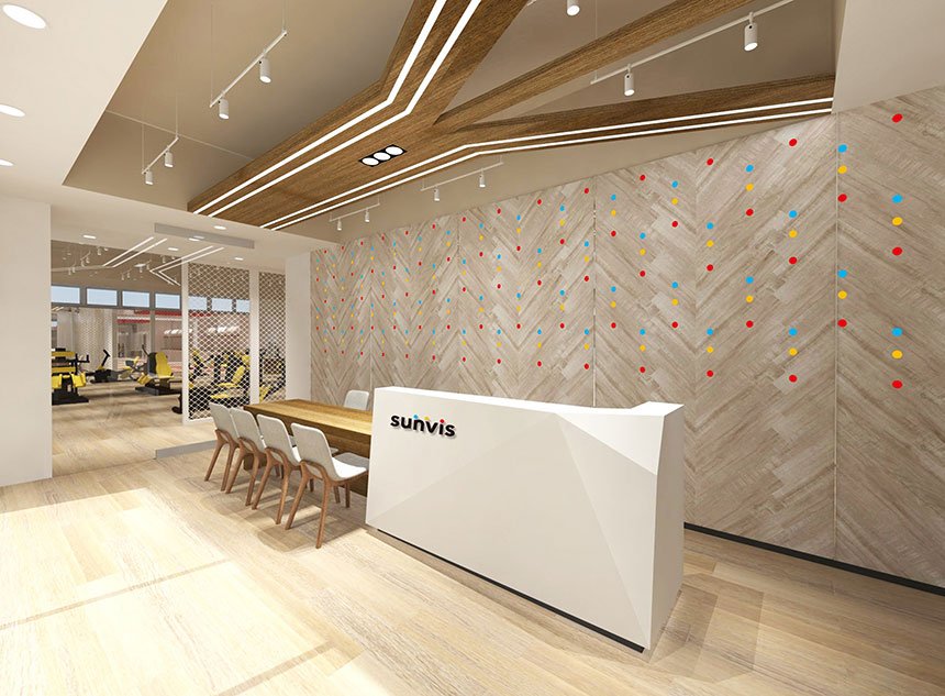 Sunvis 陽光活力中心在進行空間規劃與主體視覺識別之際,並不著意強調其與樂齡階段的連結;同樣負責操刀的艾森形象設計決意擺落「復建診所」般死氣沉沉的制式裝潢,亦不採用政令宣導式的標語海報,相反的,卻選擇以明亮、活潑的暖色系妝點細節,使得分屬中心兩端的運動場域和用膳環境相得益彰,呈現舒心樂活的平衡意象。