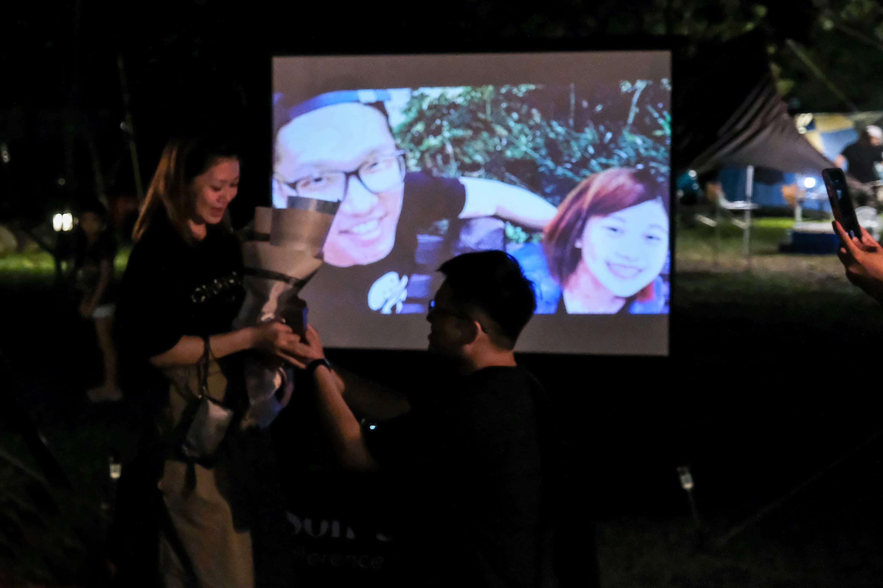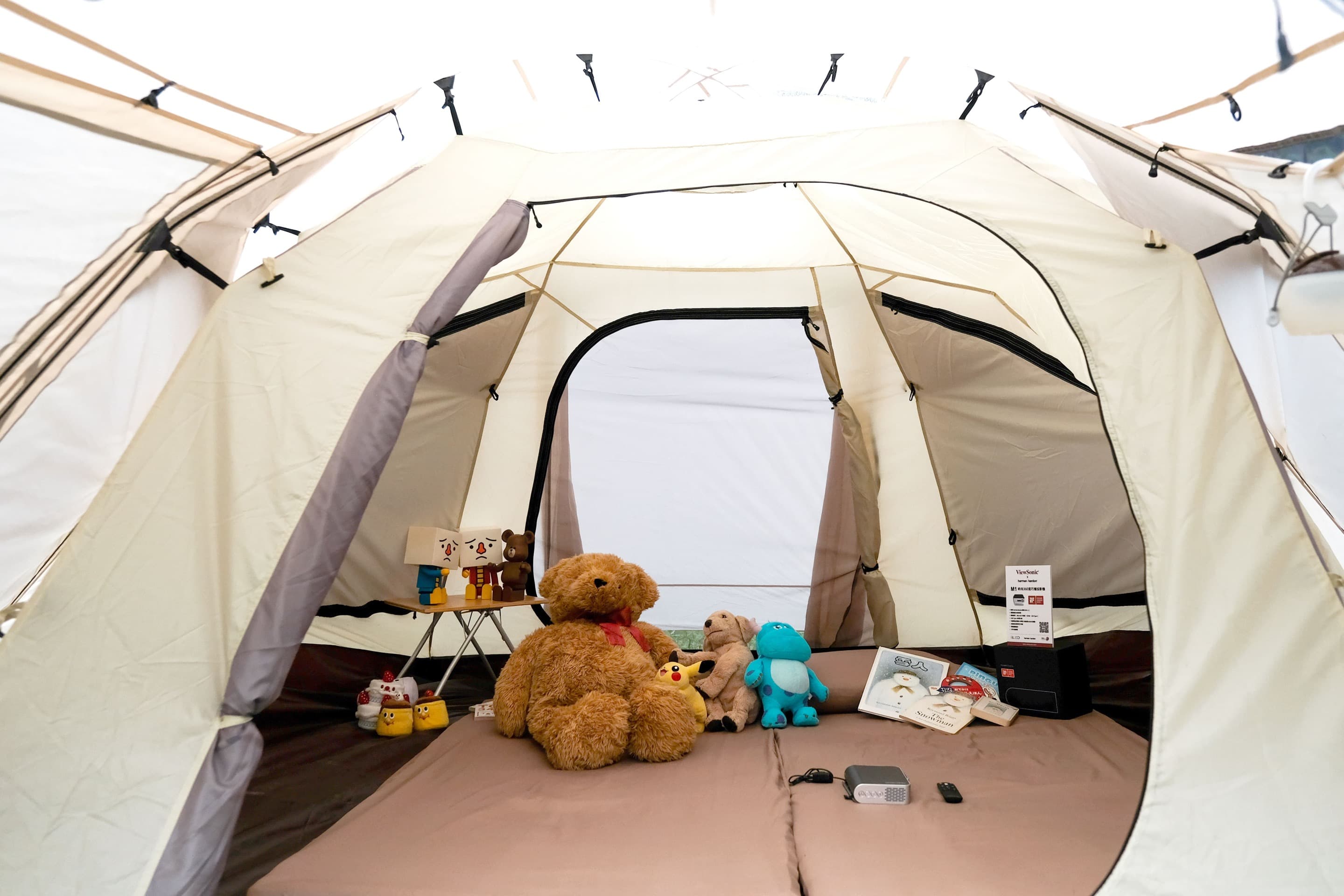降及日暮時分,在山光水影的圍環下,「星空放映室」緊接著登場了。我們依據 ViewSonic M1 內含的多項功能安排活動場地,每一頂白帳底下均設計不同的主題內容,除了播放商務簡報或發揮 Harman Kardon 出色音響的午後音樂時光,孩童得以相互邀集玩電動遊戲,就著 ViewSonic M1 投映出的高彩畫面相互競賽;大人們則可一面啜飲酸甜爽口的精釀啤酒,一面歪坐摺疊沙發椅間欣賞電影,在風吹草動的戶外環境中安享一頓視聽的華宴。而 ViewSonic M1 的巧攜特性,更讓浪漫的你,能秘密地籌備一場戶外求婚!